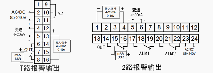 | 17 | OP_B | 輔助控輸出 | ‘0’無輸出;‘1’RS232或RS485通訊信號(hào);‘2’接微型打印機(jī)‘3’0~10mA或0~5V變送輸出;‘4’4~20mA或1~5V變送輸出 |